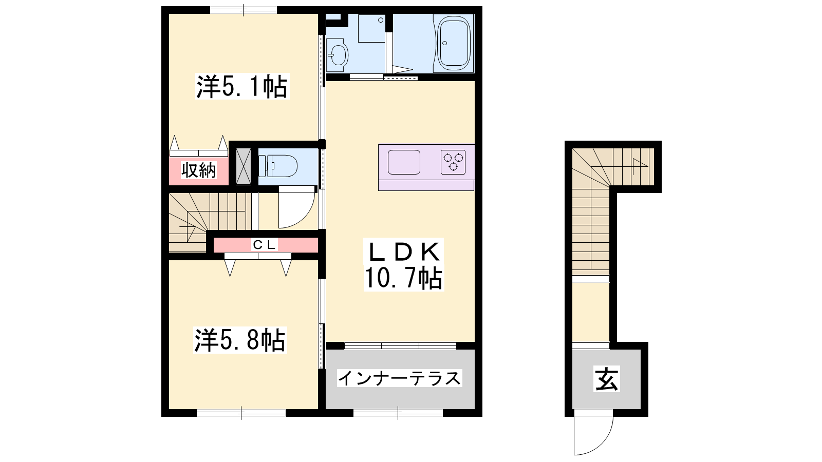 - LDK10.7帖、洋室5.8帖、洋室5.1帖