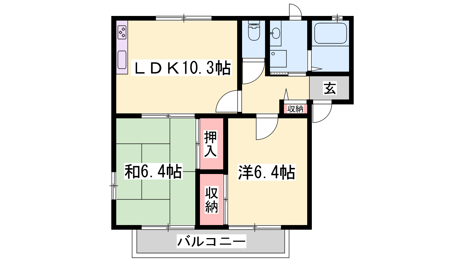 - LDK10.3帖、洋室6.4帖、和室6.4帖