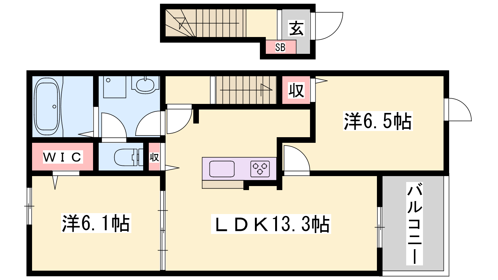 - LDK13.3帖、洋室6.1帖、洋室6.5帖
