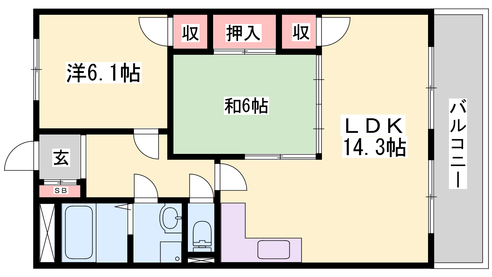 - LDK14.3帖、洋室6.1帖、和室6帖