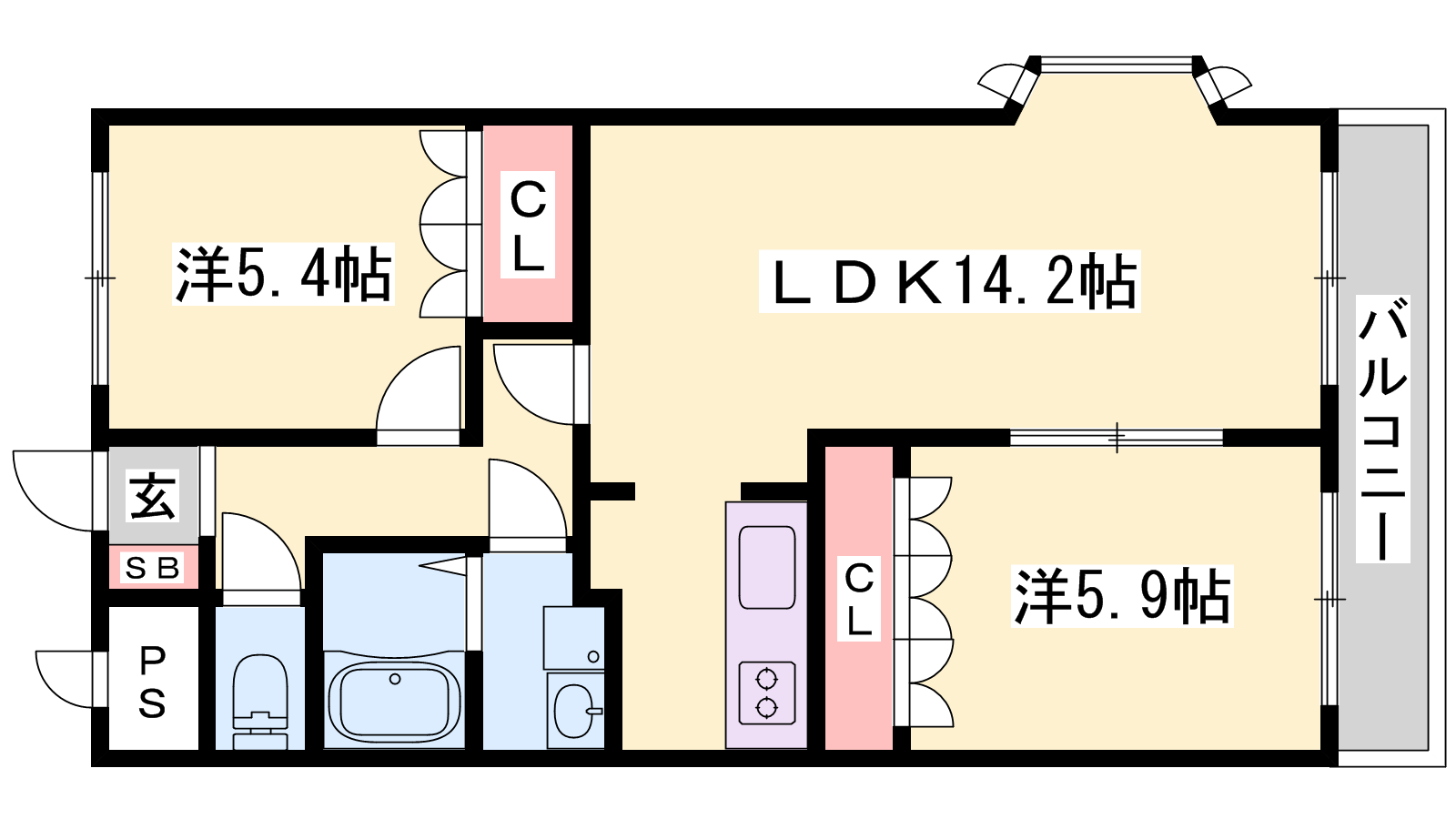 - LDK14.2帖、洋室5.9帖、洋室5.4帖