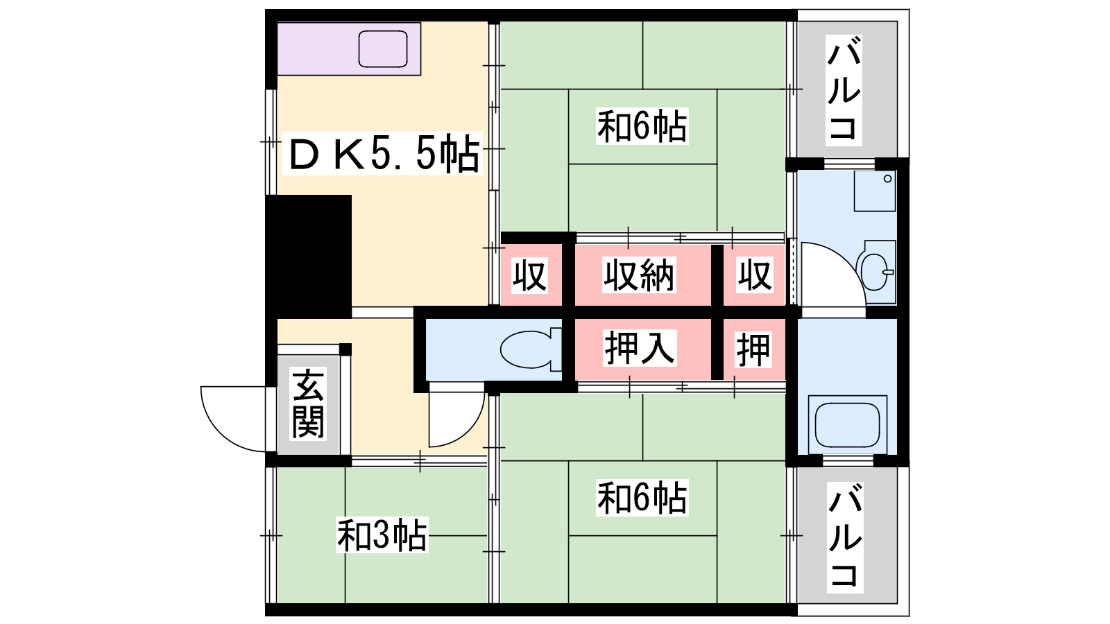 - K5.5帖、洋室6帖、和室6帖、和室3帖