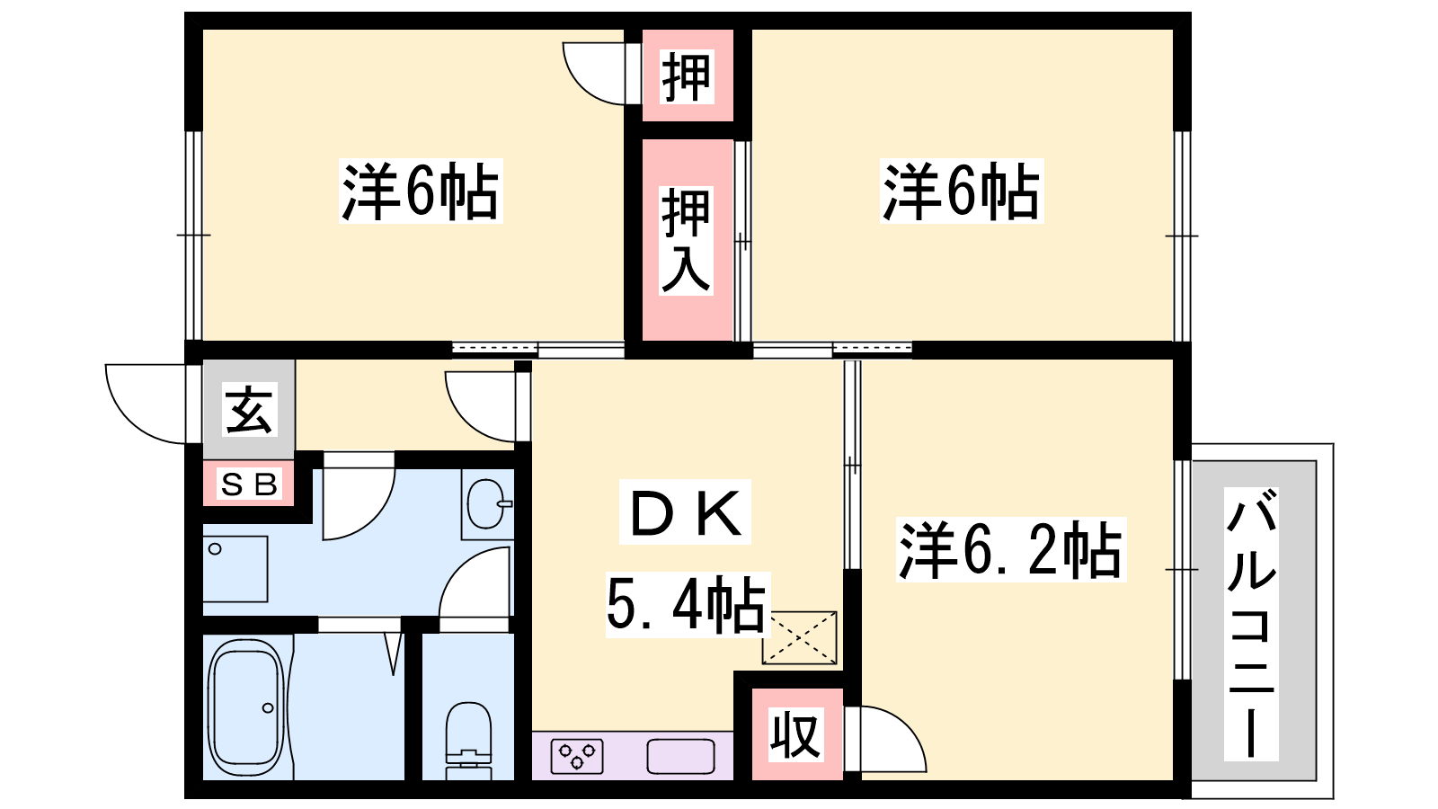 - DK5.4帖、洋室6.2帖、洋室6帖、洋室6帖