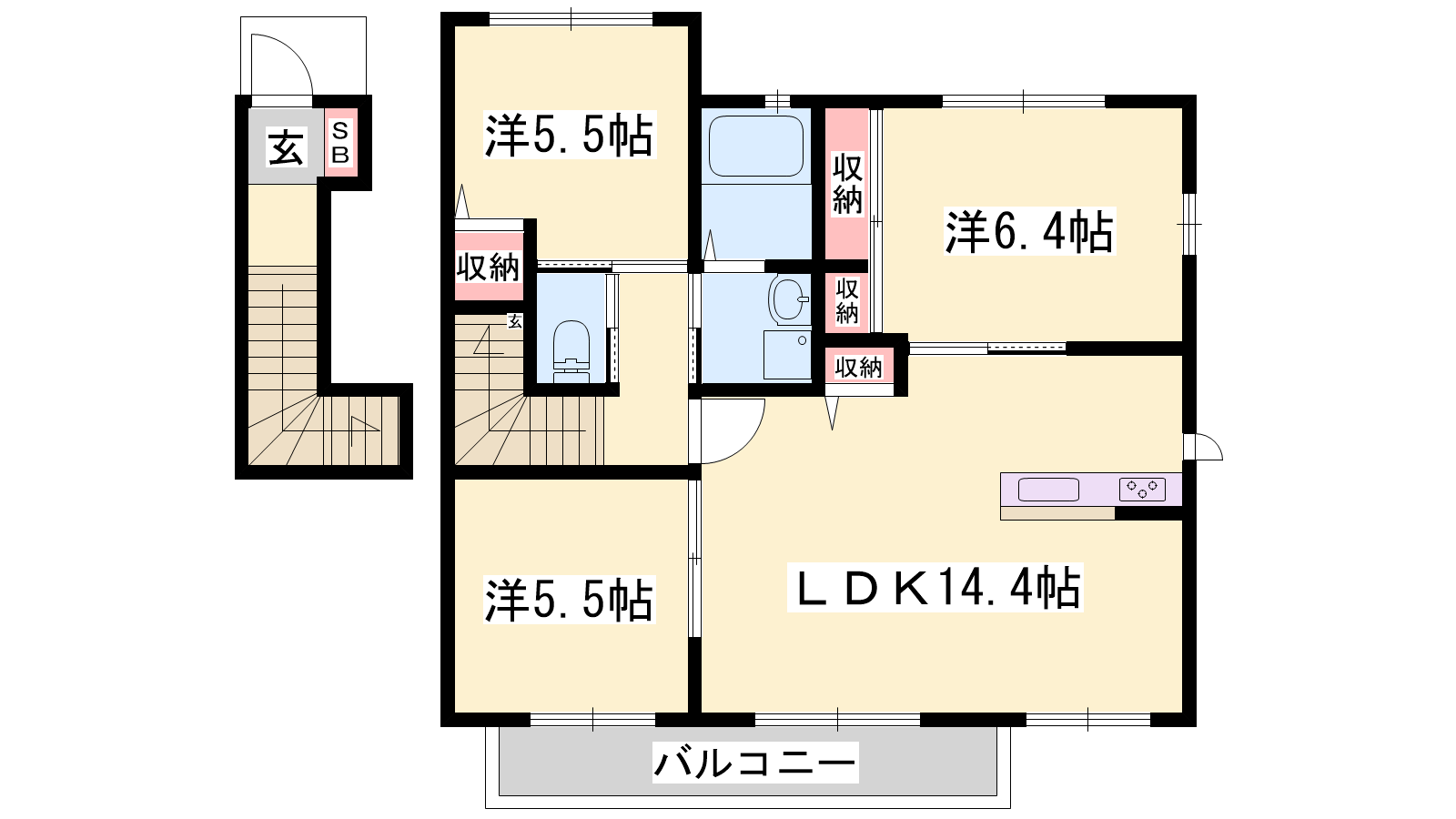 - LDK14.4帖、洋室6.4帖、洋室5.5帖、洋室5.5帖