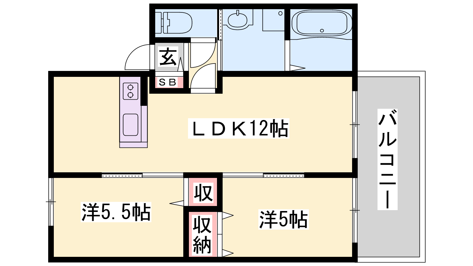 - LDK12帖、洋室5帖、洋室5.5帖