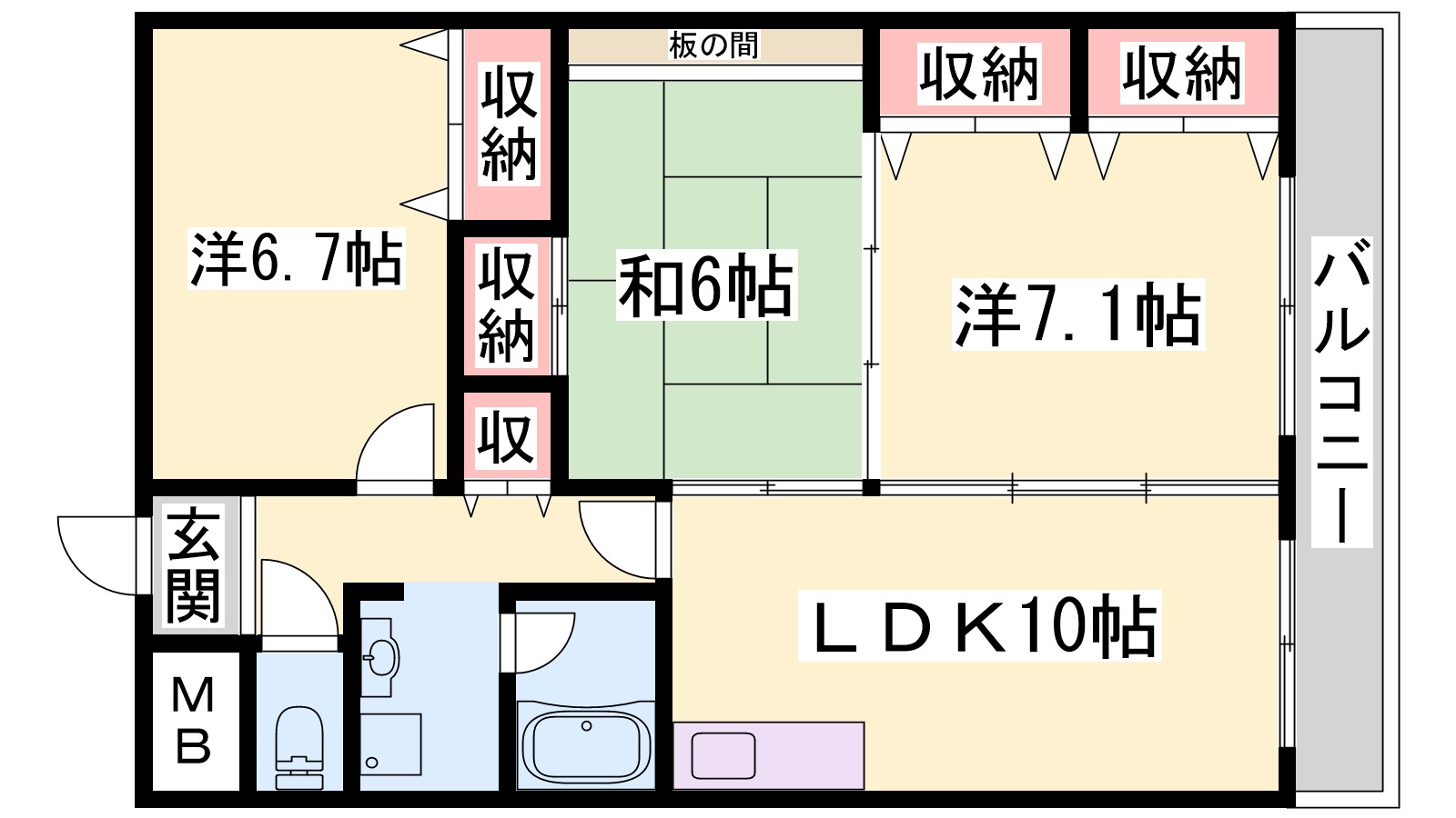 - LDK10帖、洋室7.1帖、洋室6.7帖、和室6帖