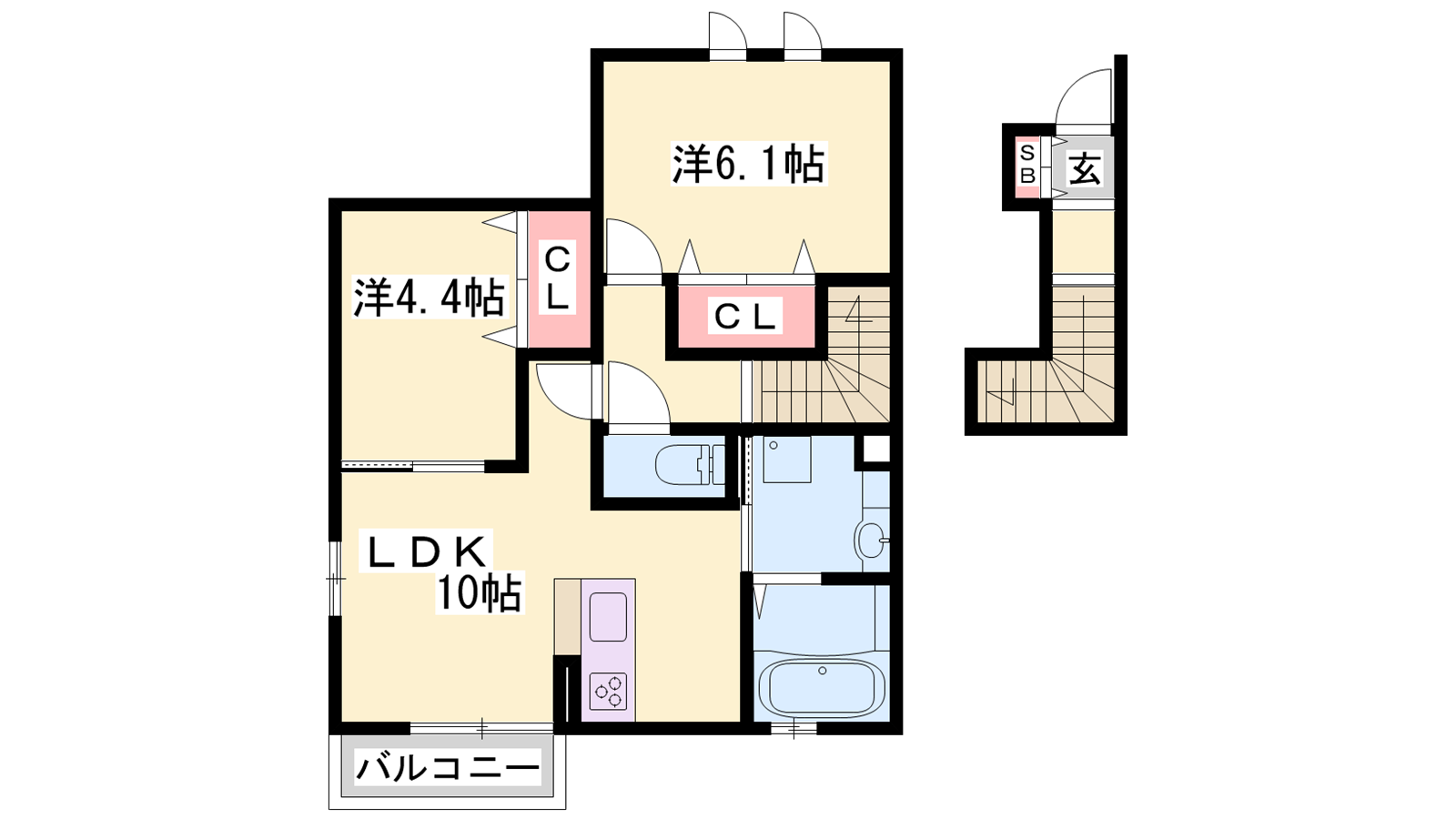 - LDK10帖、洋室6.1帖、洋室4.4帖