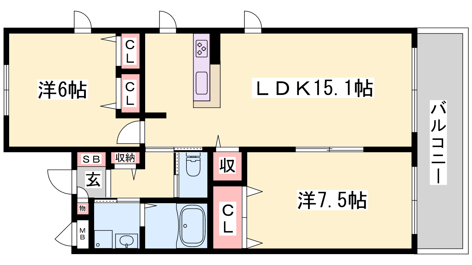 - LDK15.1帖、洋室7.5帖、洋室6帖