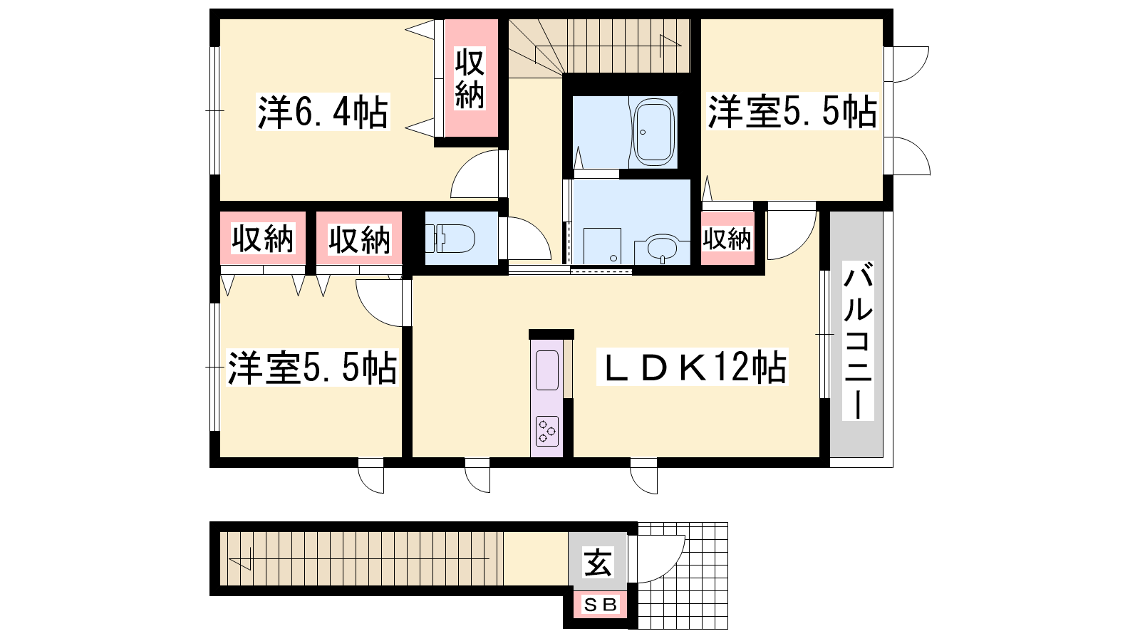 - LDK12帖、洋室5.5帖、洋室5.5帖、洋室6.4帖