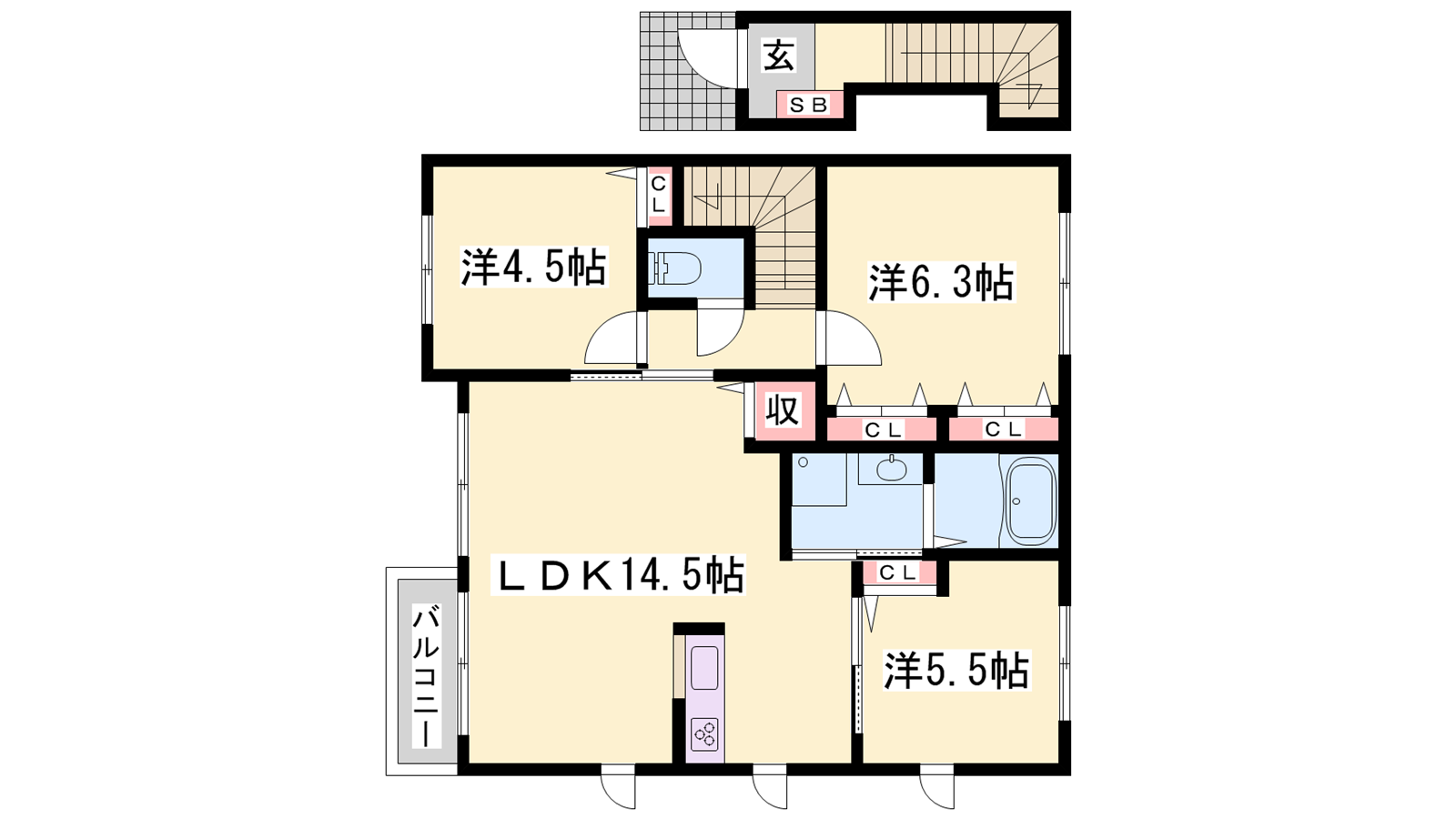 - LDK14.5帖、洋室6.3帖、洋室5.5帖、洋室4.5帖