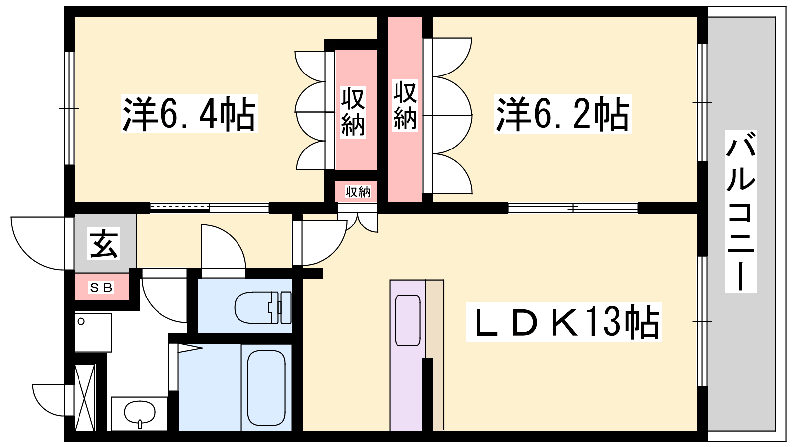 - LDK13帖、洋室6.4帖、洋室6.2帖