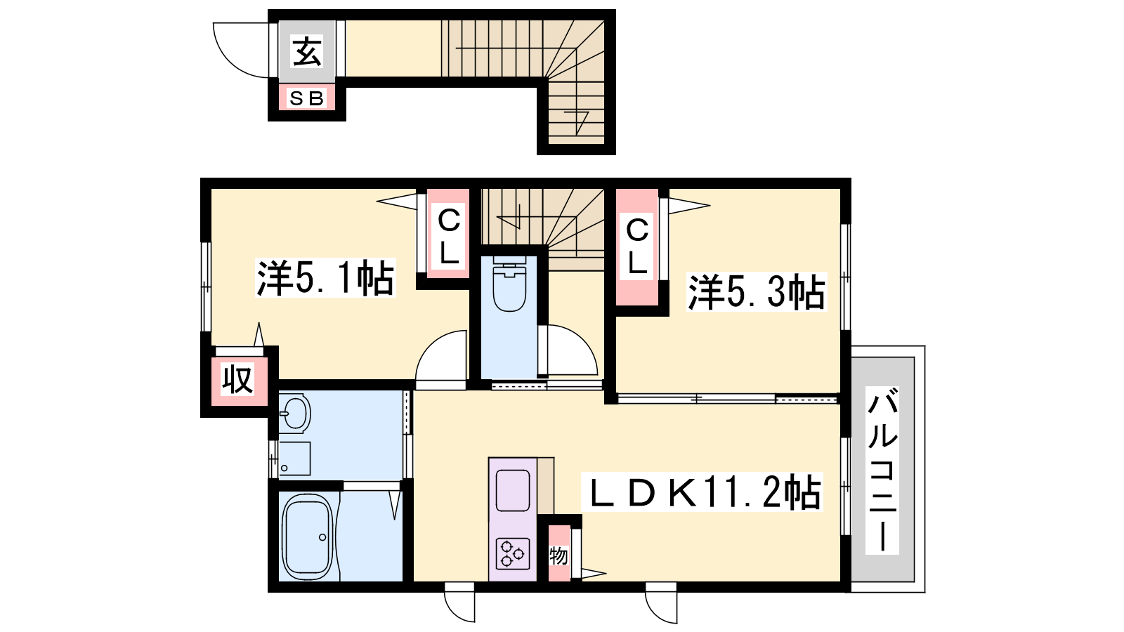 - LDK11.2帖、洋室5.3帖、洋室5.1帖