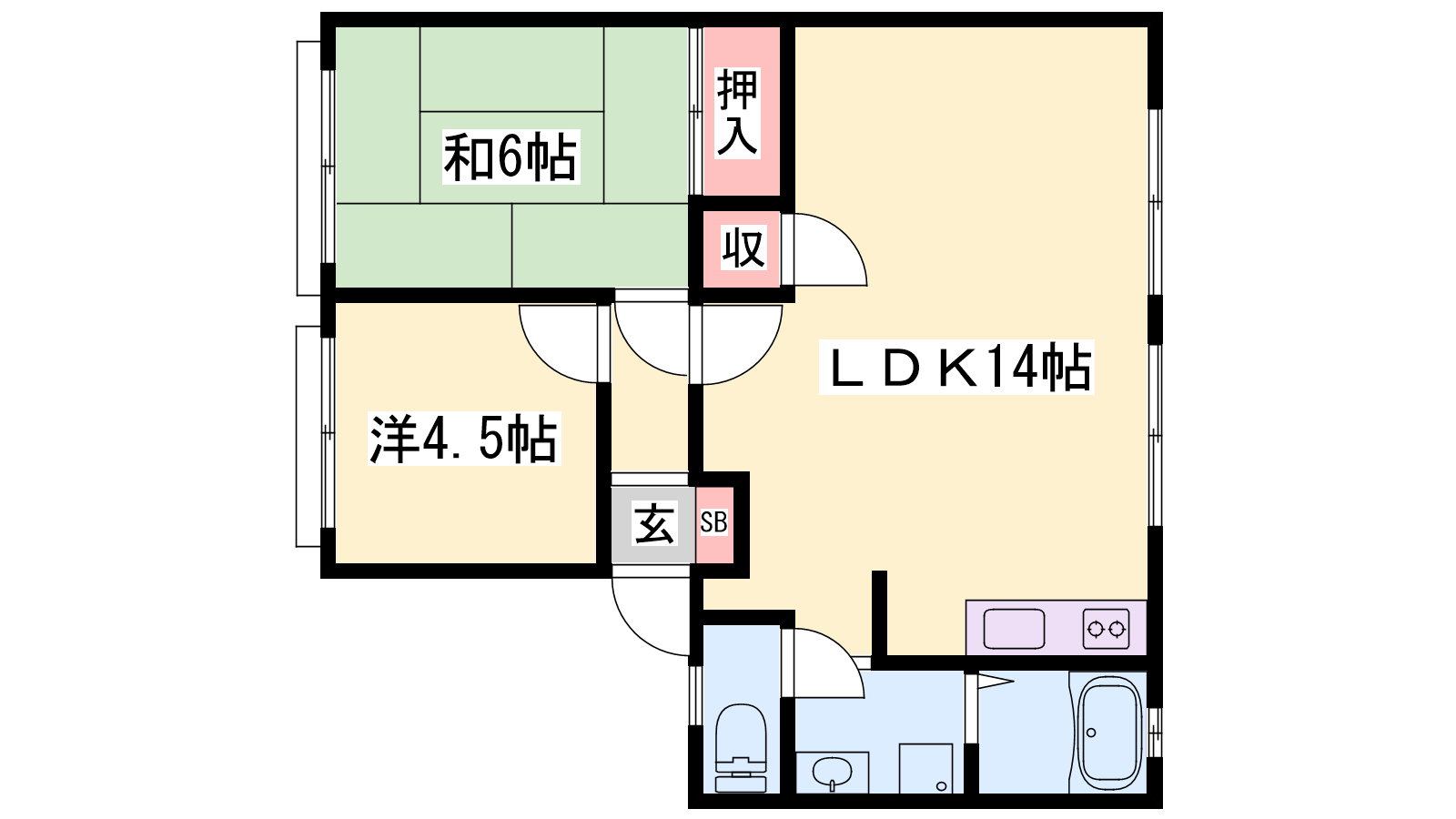 - LDK14帖、洋室6帖、洋室4.5帖