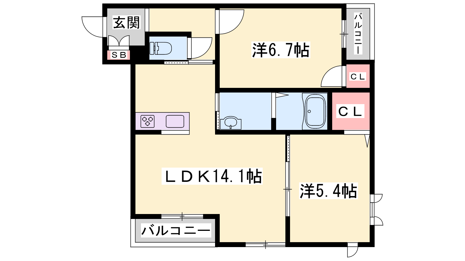 - LDK14.1帖、洋室6.7帖、洋室5.4帖