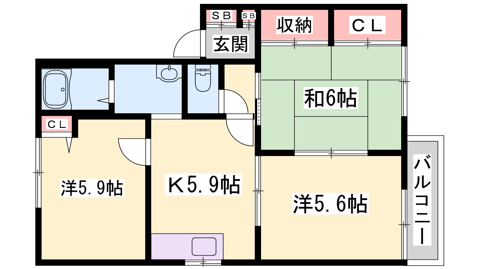 - K5.9帖、洋室5.9帖、洋室5.6帖、和室6帖