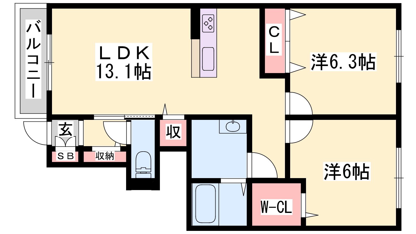 - LDK13.1帖、洋室6.3帖、洋室6帖