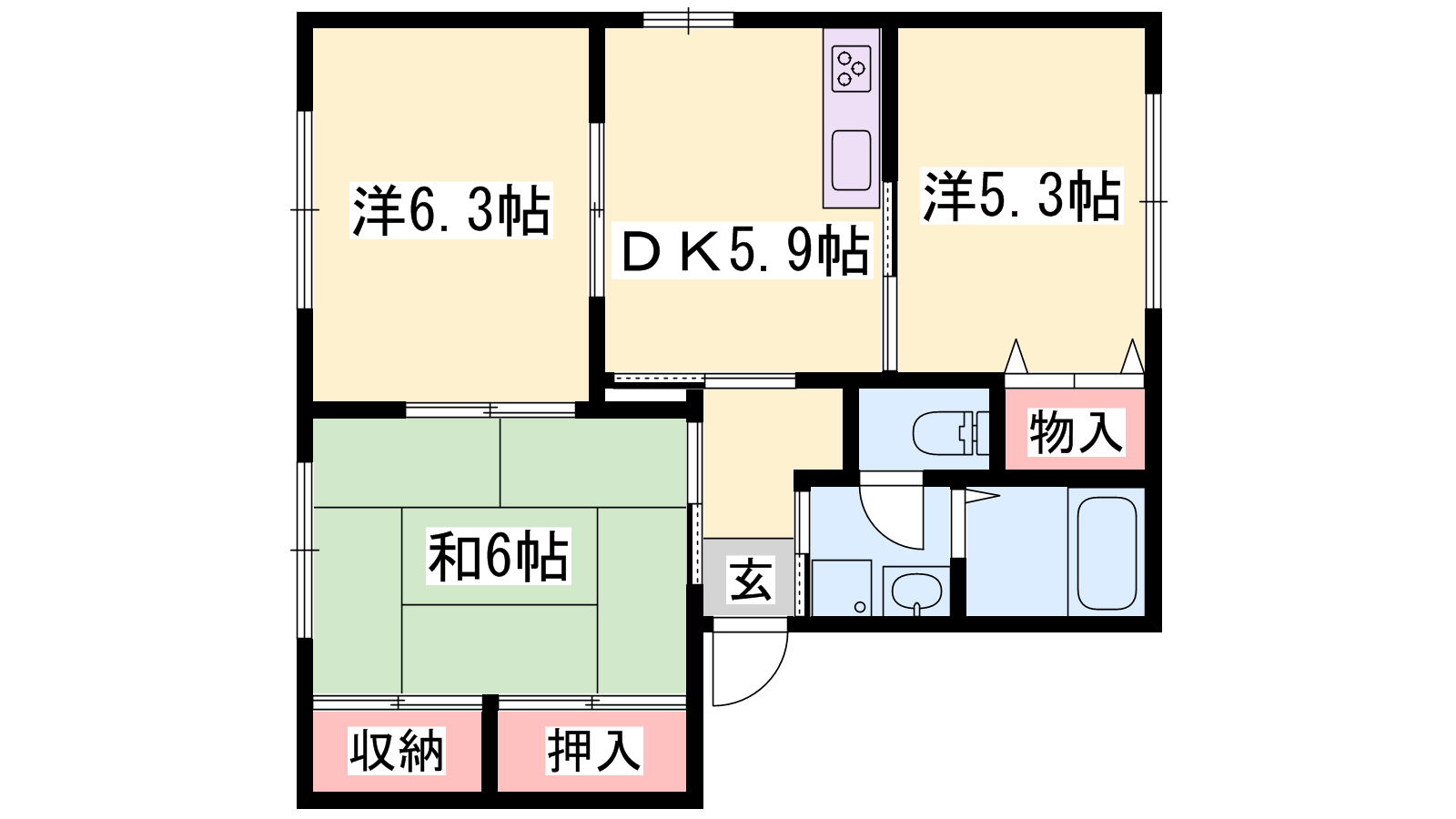 - K5.9帖、洋室5.3帖、洋室6.3帖、和室6帖