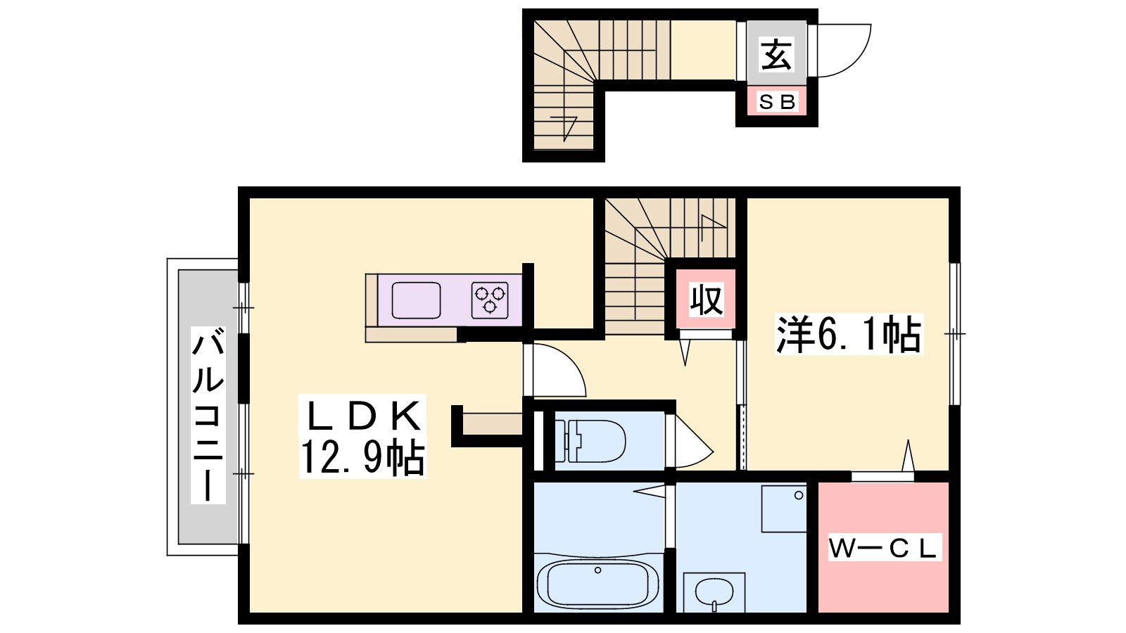 - LDK12.9帖、洋室6.1帖