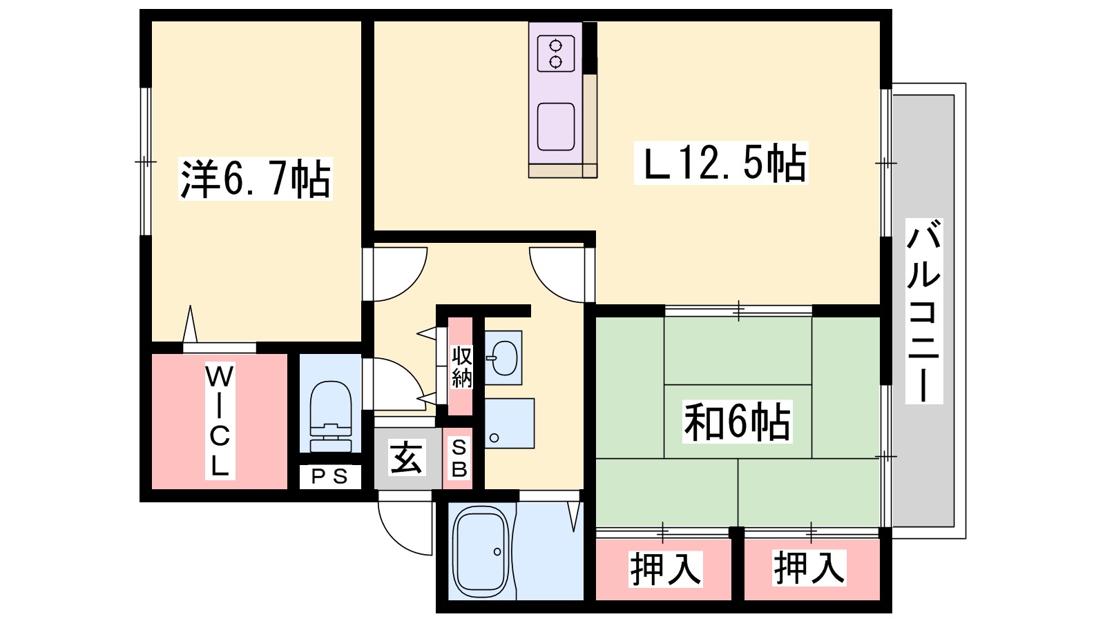 - LDK12.5帖、洋室6.7帖、和室6帖