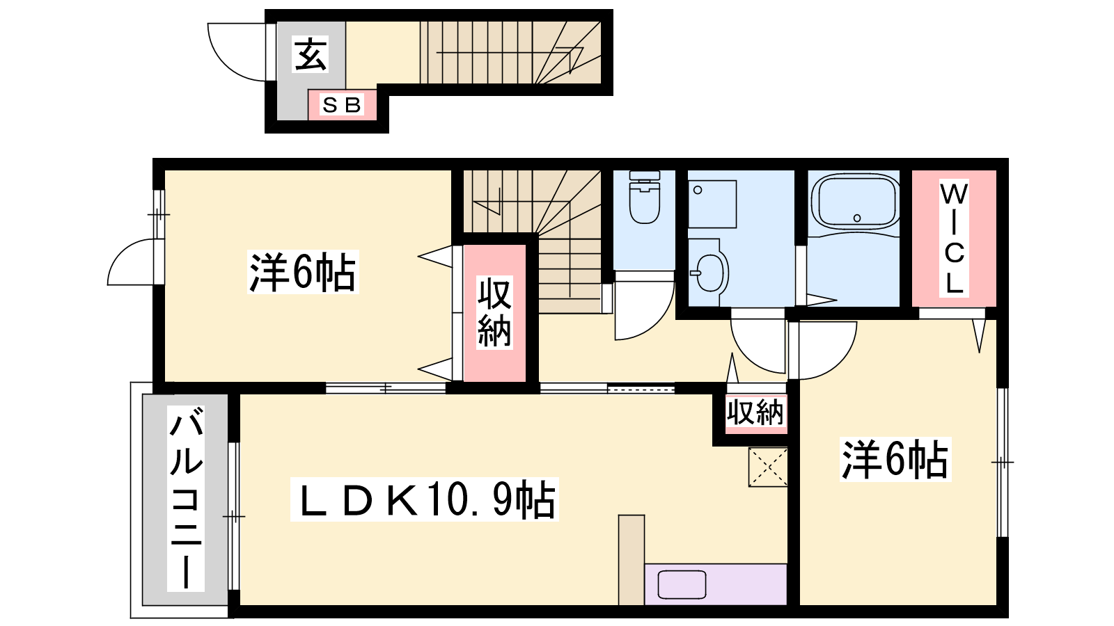 - LDK10.9帖、洋室6帖、洋室6帖