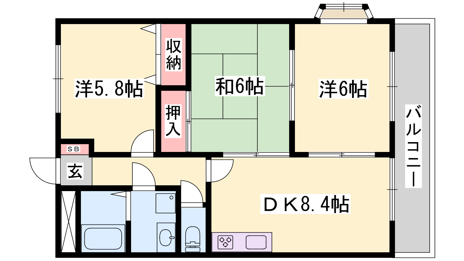 - DK8.4帖、洋室6帖、洋室5.8帖、和室6帖