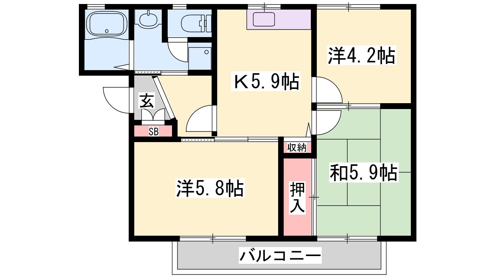 - K5.9帖、洋室5.8帖、和室5.9帖、洋室4.2帖