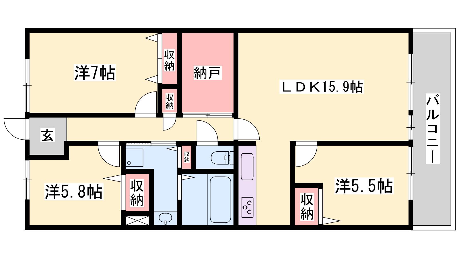 - LDK15.9帖、洋室7帖、洋室5.8帖、洋室5.5帖