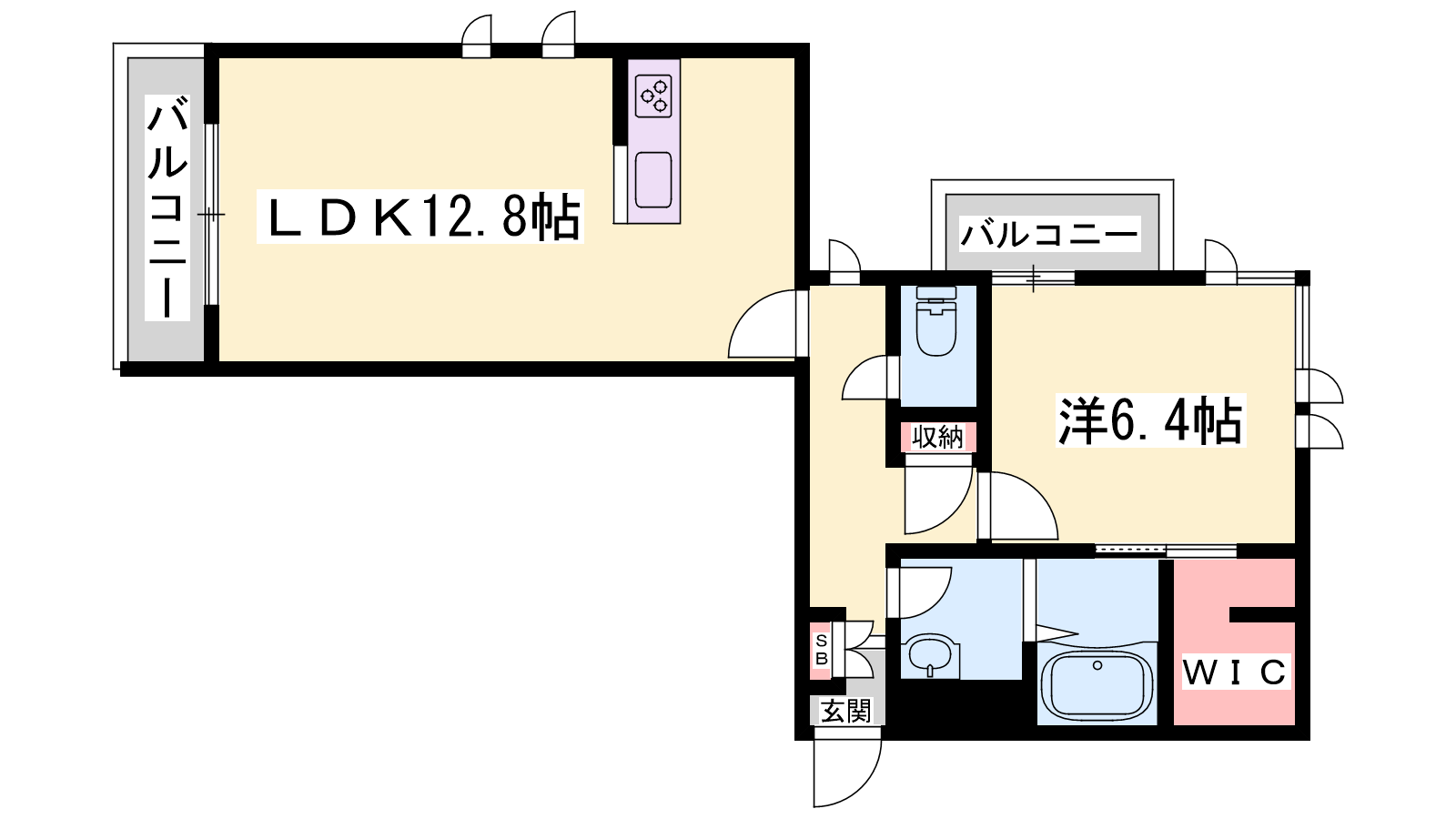 - LDK12.8帖、洋室6.4帖