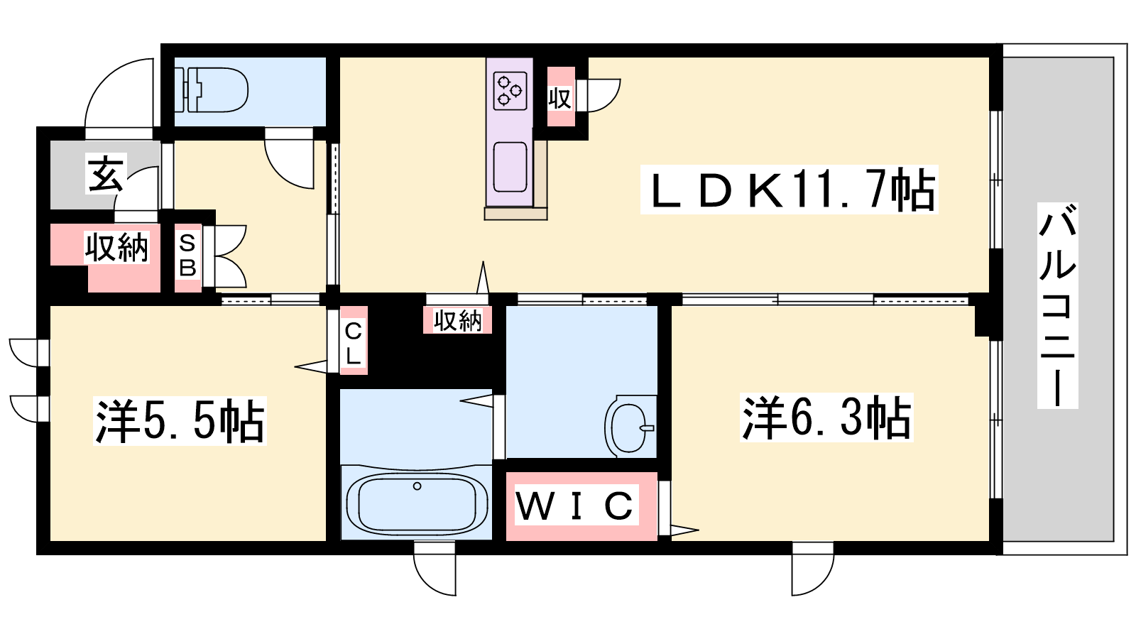 - LDK11.7帖、洋室6.3帖、洋室5.5帖
