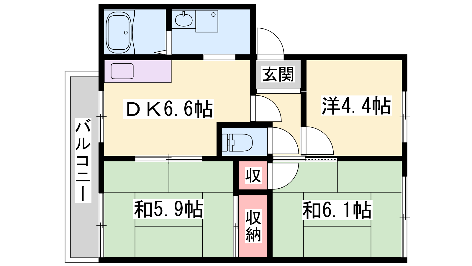 - DK6.6帖、和室6.1帖、洋室4.4帖、和室5.9帖
