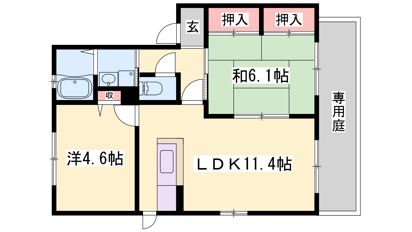 - LDK11.4帖、洋室4.6帖、和室6.1帖