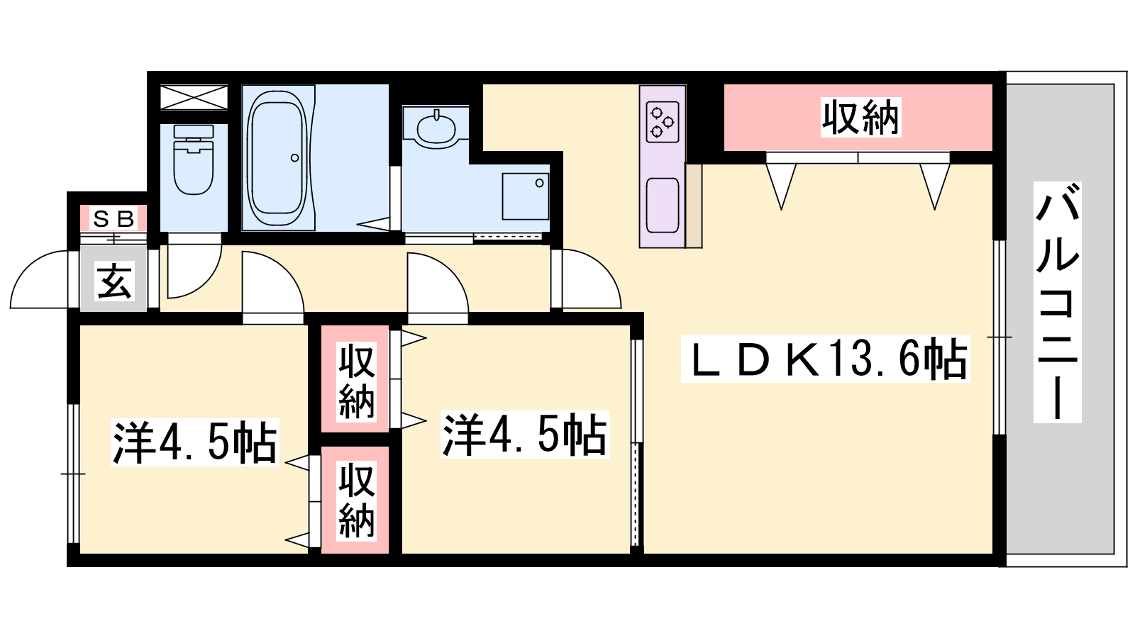 - LDK13.6帖、洋室4.5帖、S4.5帖