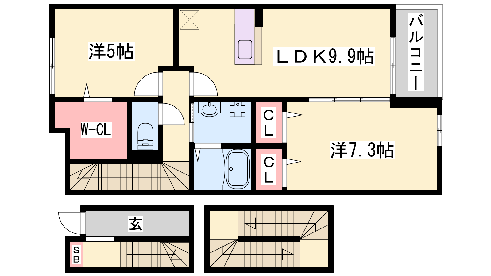 - LDK9.9帖、洋室7.3帖、洋室5帖