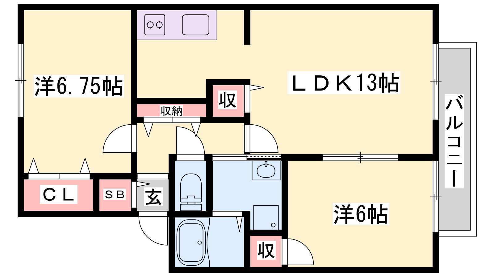 - LDK13帖、洋室6.7帖、和室6帖