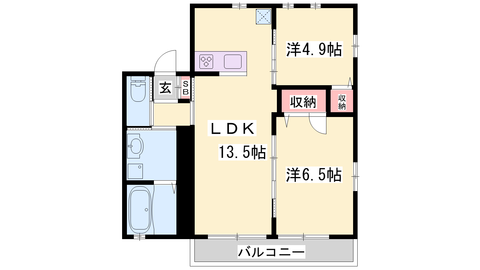 - LDK13帖、洋室6.5帖、洋室4.9帖