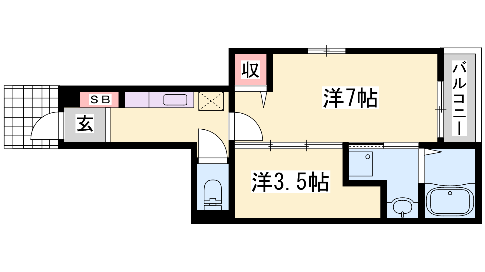 - K2帖、洋室7帖、S3.5帖
