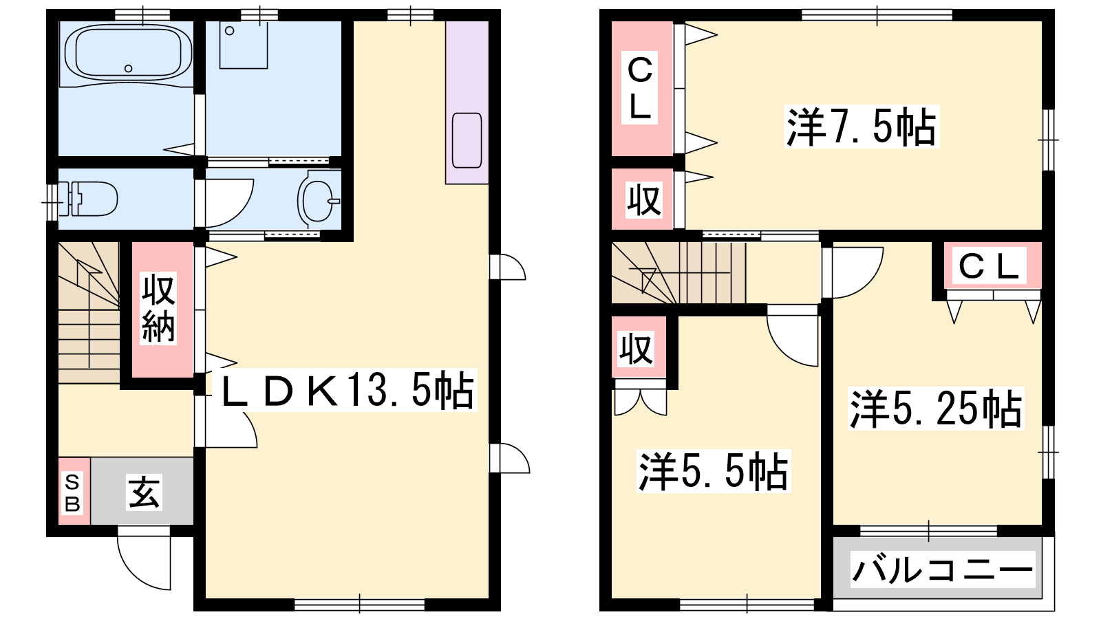 - LDK13.5帖、洋室7.5帖、洋室5.5帖、洋室5.25帖
