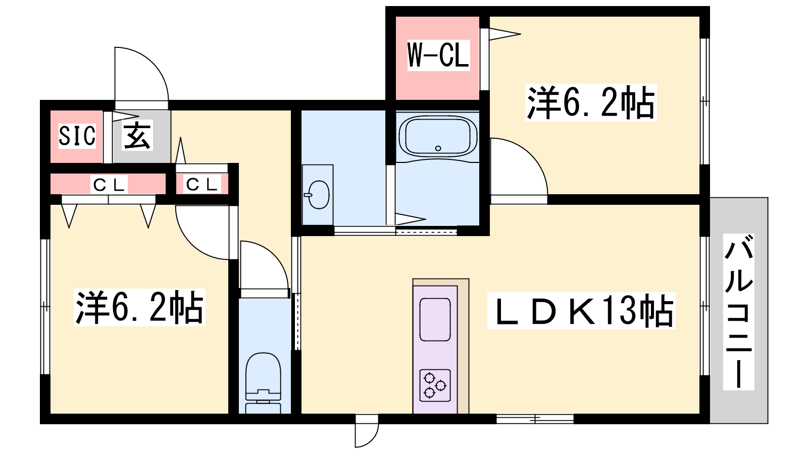 - LDK13帖、洋室6.2帖、洋室6.2帖