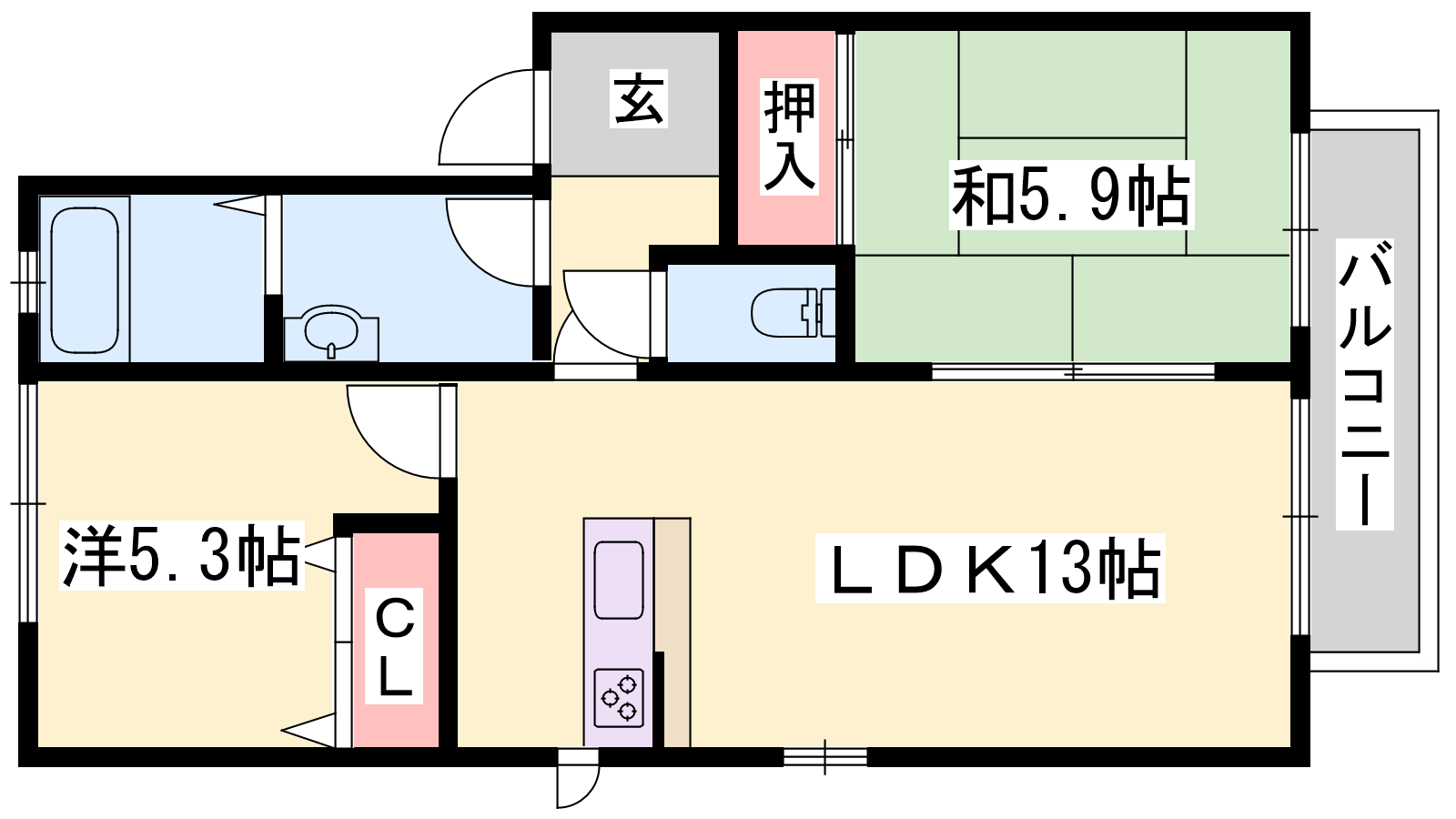 - LDK13帖、和室5.9帖、洋室5.3帖