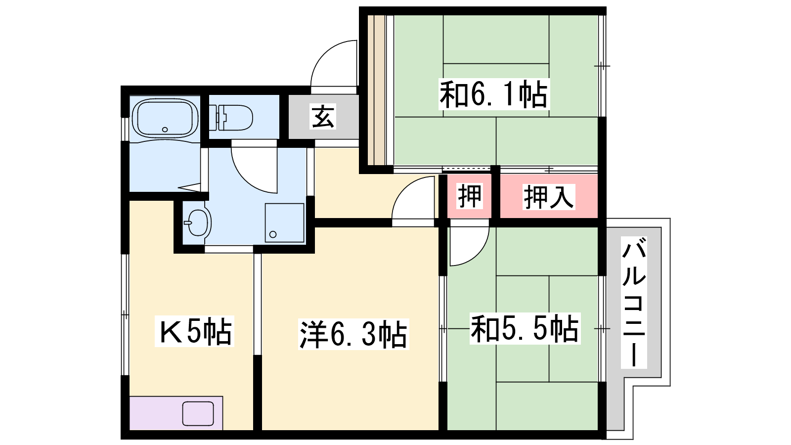- K5帖、洋室6.3帖、和室5.5帖、和室6.1帖