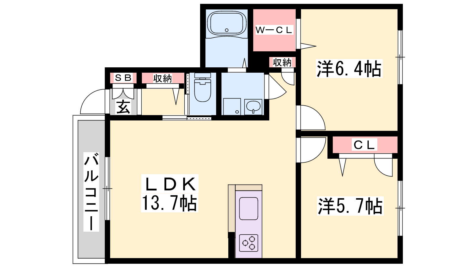 - LDK13.7帖、洋室6.4帖、洋室5.7帖